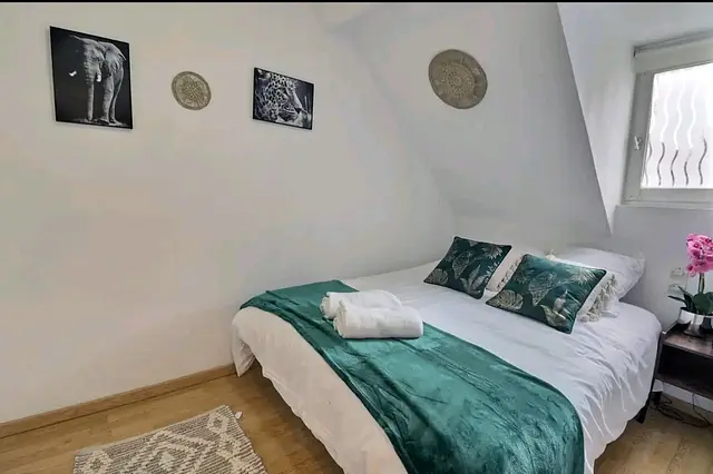 Appartement champenois en pierre avec poutres situé à proximité de la belle Cathédrale de Troyes meublé et équipé comprenant : une entrée avec placard de rangements, une salle d'eau avec WC, 1 chambre avec un lit double et placard de rangements, 1 chambre avec un lit simple, un séjour vue sur Cathédrale ouvert sur kitchenette équipée, une machine à laver