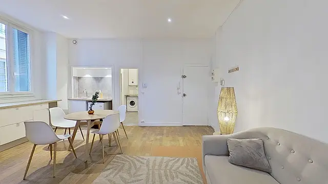 Le séjour offre une belle pièce de vie lumineuse, aménagée avec un canapé, une table basse et un espace salle à manger équipé d’une table ronde et de quatre chaises. Le charme de l’ancien se retrouve dans les parquets bois et la cheminée décorative, tandis qu’une verrière intérieure apporte du caractère et une agréable ouverture vers la chambre. Le logement est équipé d’une climatisation, apportant un confort supplémentaire.