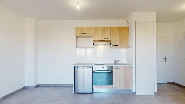 La cuisine est ouverte sur le séjour et intégrée de manière fonctionnelle. Elle est équipée d’une plaque de cuisson, d’un four et d’un réfrigérateur, avec des meubles aux finitions bois clair et un plan de travail sobre. L’ensemble s’inscrit dans un style moderne et épuré, cohérent avec la construction récente du bâtiment.