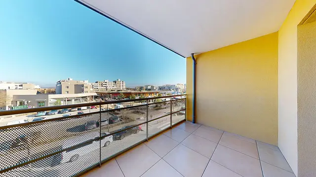Le logement dispose d’une belle terrasse, accessible depuis le séjour, offrant un espace extérieur abrité avec vue dégagée sur l’environnement résidentiel et commercial alentour.