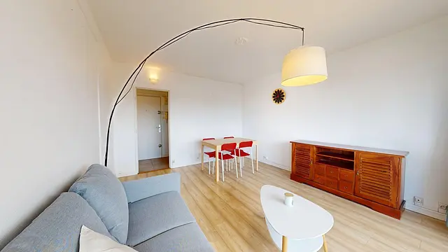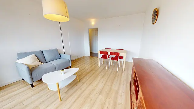 Ce T2 lumineux et sans vis à vis s'ouvre sur une pièce de vie de 15.28 m², aménagée d'un canapé, d'une table avec quatre chaises, d'un buffet ainsi que d'une table basse.