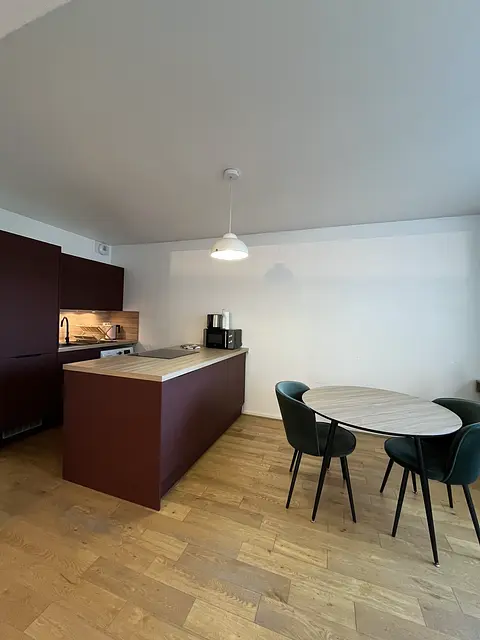 - Cuisine ouverte : Entièrement équipée (micro-ondes, plaques de cuisson, hotte, réfrigérateur/congélateur, machine à laver, grille-pain et ustensiles). Un espace salle à manger complète cette pièce conviviale.