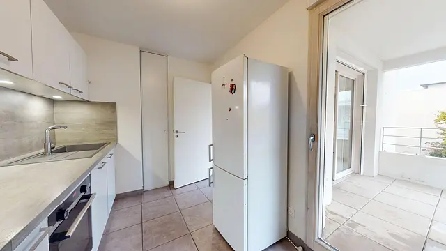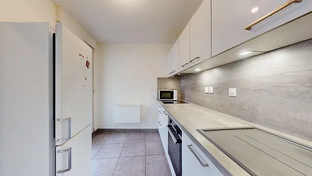 La cuisine dispose d'un four, d'un micro-ondes, d'un réfrigérateur avec compartiment congélateur, de rangements, de plaques de cuisson, d'une hotte et d'un évier. Cette pièce donne également accès au balcon.
