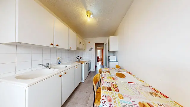 La cuisine séparée est entièrement équipée pour un usage quotidien : four, micro-ondes, plaques de cuisson, hotte, évier, réfrigérateur avec compartiment congélateur, lave-vaisselle, ainsi que de nombreux rangements. Un espace repas avec table et chaises est également disponible pour vos repas en toute simplicité.