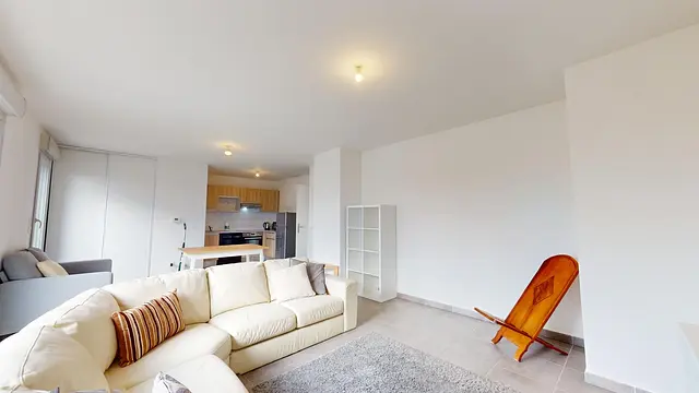 La pièce de vie est meublée avec deux canapés, un meuble à rangement, une étagère et une table à manger. Une grande terrasse agrandit la pièce et la rend lumineuse. Cela vous fera gagner en espace et en confort.